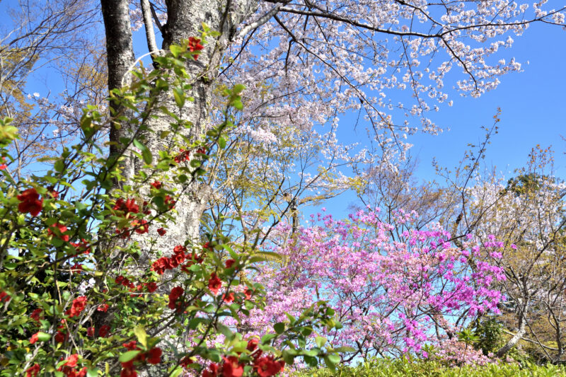 枝垂れ桜【多宝殿前】や紅枝垂桜【曹源池庭園】の見頃は、3月末~4月中旬 です。