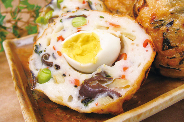 【伊勢ひりょうず】の人気の秘密は、魚のすり身と豆腐を合わせ、〈うずらの卵、わかめ、伊勢ひじき、きくらげ、人参、筍、椎茸、枝豆、ごぼう〉の9種類のからだによい素材が、たっぷり練り込まれているのです。
