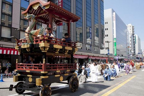 昭和4年の産業振興の目的で、市内のパレードが始まり、終戦後は、地元企業の山車や古町芸妓も入り大変賑やかに行われたそうです。