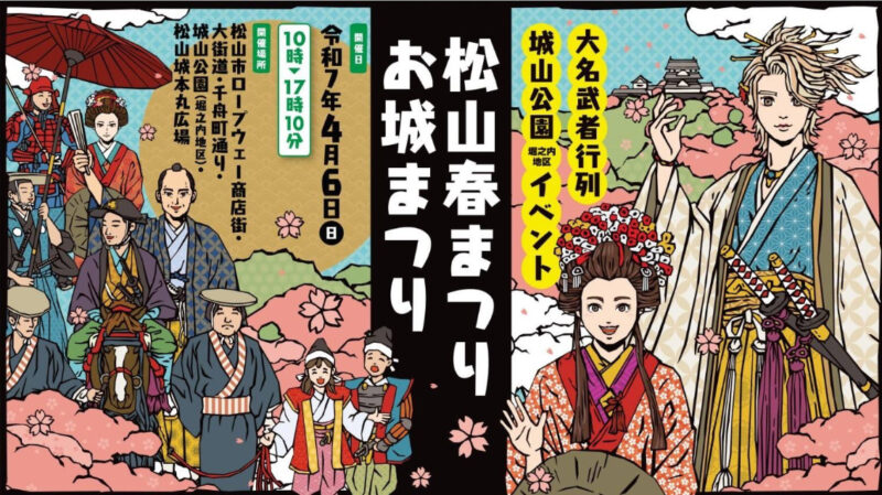 ここでは、松山春まつり2025の日程・時間や場所、屋台の出店、お姫様・ゲスト、大名行列等見どころ、アクセスや駐車場、交通規制について紹介しました。