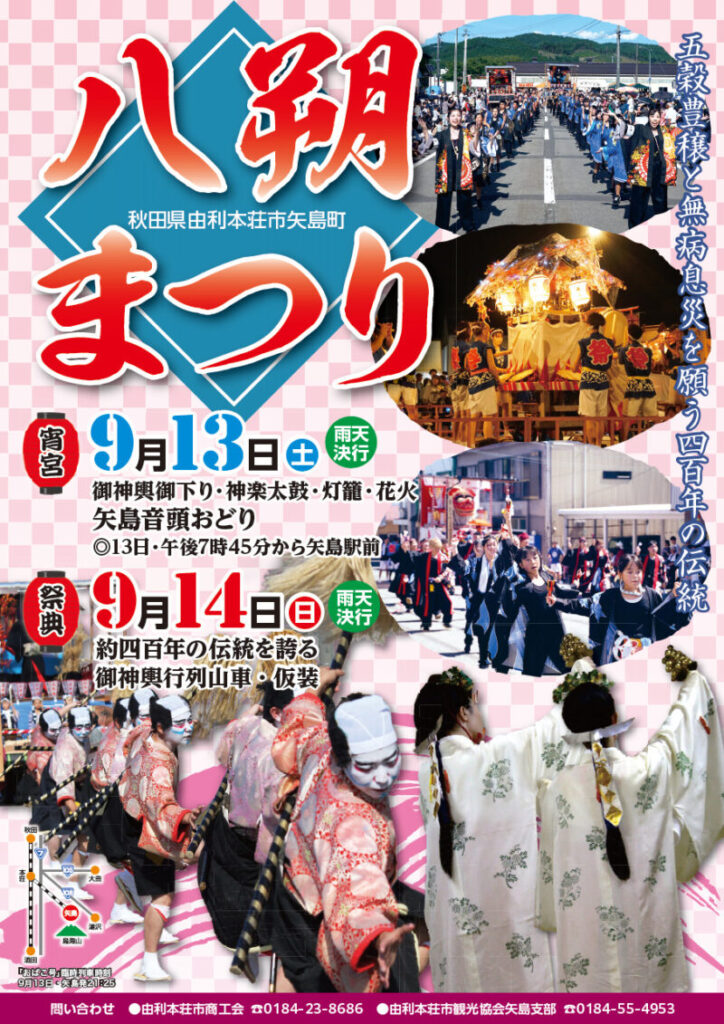 矢島八朔祭りは、現在では9月第2日曜日に祭典が、その前日の土曜日に宵宮が開催されることとなっています。