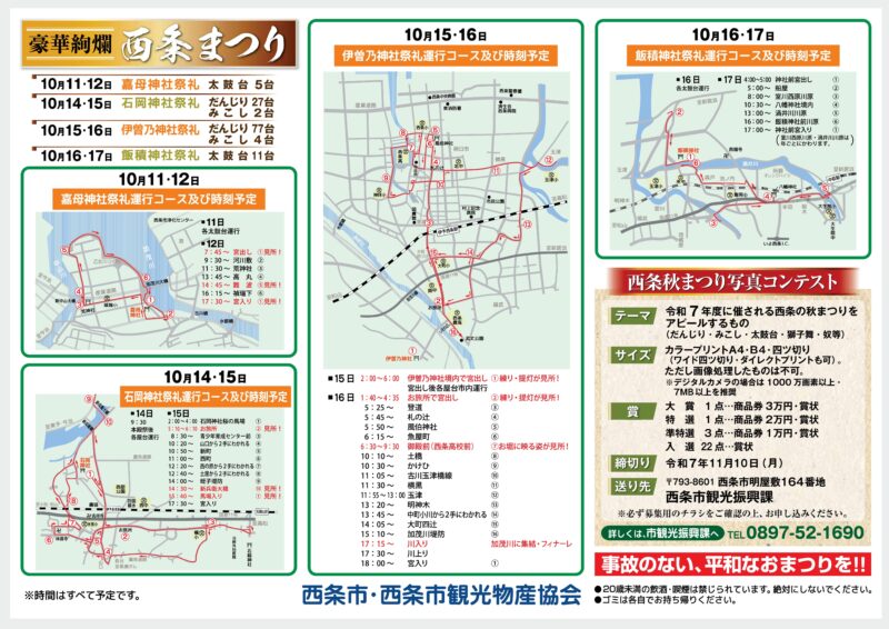 ここでは、西条まつり2025の日程・時間(スケジュール)やだんじり運行コース、アクセスや駐車場、交通規制、歴史や川入等見どころを紹介しました。