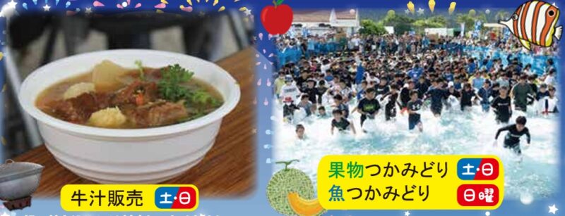 例年「魚・果物つかみ取り大会」や「ギネス級大鍋牛汁」などが開催されます。