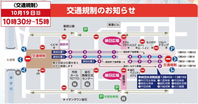 大町や只越町では歩行者天国になり、郷土芸能の演目も見ることができます。