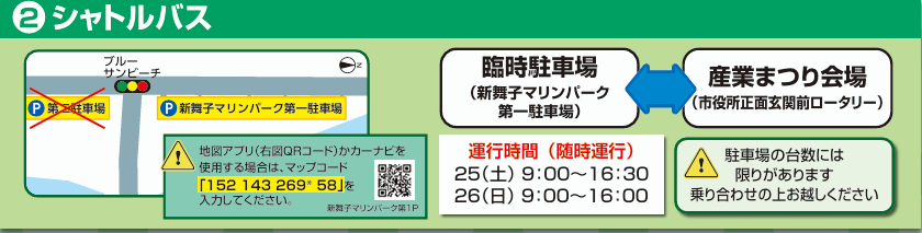 ここからは、産業まつり会場まで無料のシャトルバスが随時運行されます。 運行時間は以下の通りです: