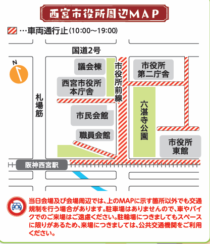 にしのみや市民祭りでは10:00~19:00の間、会場周辺が車両通行止になります。