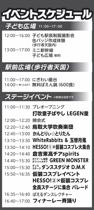 「ステージイベント」や「サンバ」に「子供広場」と、どんな年代の方でも参加できて楽しめる内容となっています。