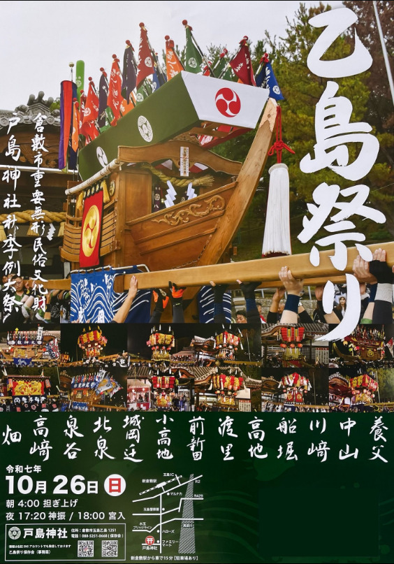 岡山県倉敷市の戸島神社秋季例大祭・乙島祭り2025について、日程や場所、屋台・露店の出店、だんじり山車・鬼舞・千歳楽等見どころ、アクセスや駐車場、交通規制等気になりますよね。ここでは、乙島祭り2025の日程や場所、屋台・露店の出店、歴史や特徴、見どころ、アクセスや駐車場、交通規制を紹介します。