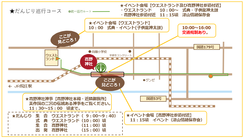 14:30~14:45に催し物会場にだんじりが勢揃いし、催し物を開催、15:45頃に再度会場を出発します。