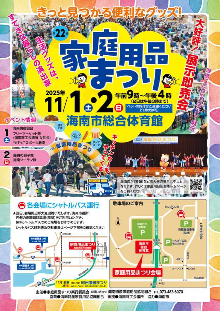 紀州漆器まつり2025と同日の11月1日(土)・11月2日(日)には第22回家庭用品まつりが海南市総合体育館で開催されます。