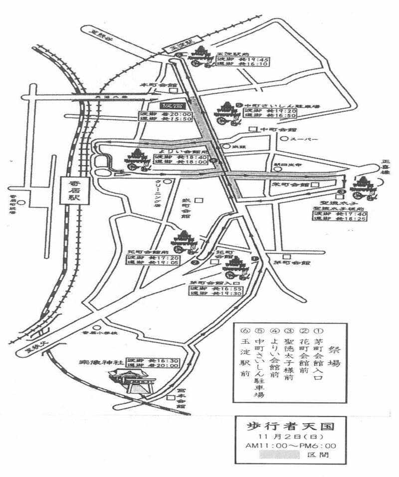 寄居市街(本町から武町の間)が歩行者天国となり、本町、中町、栄町、武町、茅町、宮本、常木の山車の曳き回しが行われます。