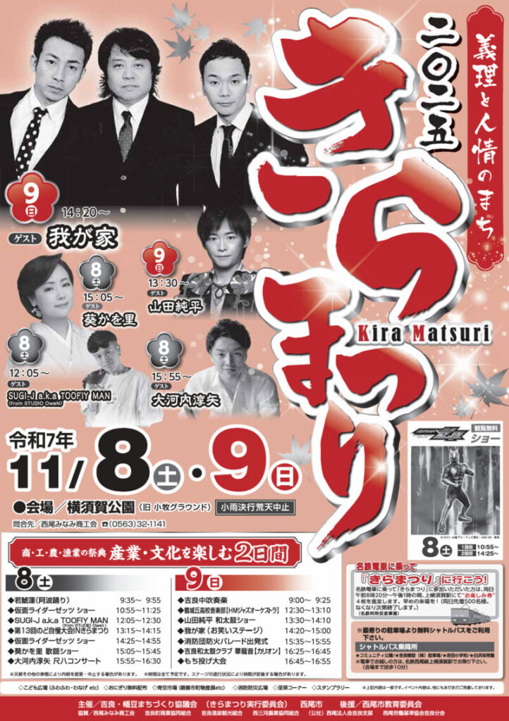 愛知県西尾市吉良町のきらまつり2025について、日程・時間(スケジュール)や場所、ゲスト、屋台・露店の出店、アクセスや駐車場・シャトルバス等気になりますよね。ここでは、きらまつり2025の日程・時間や場所、スケジュールやゲスト、屋台・露店の出店、アクセスや駐車場・シャトルバス、歴史や見どころを紹介します。