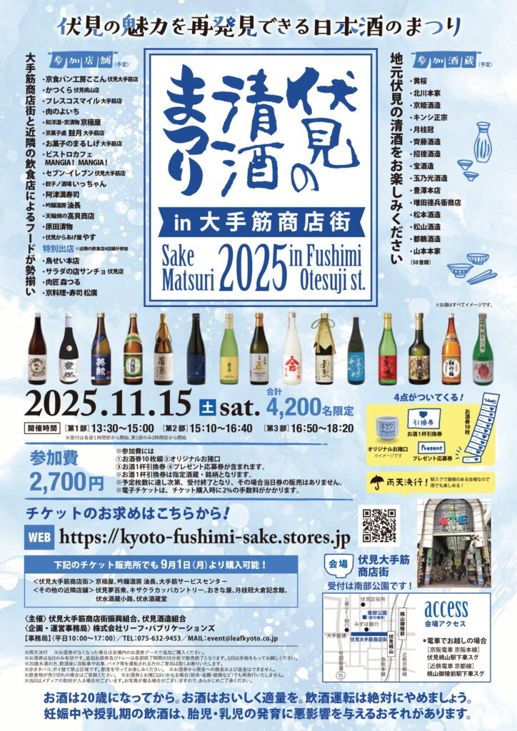 京都の伏見の清酒まつり2025 in 大手筋商店街について、開催日程・時間や場所、前売り券・当日券の料金や購入法、フード屋台の出店、アクセスや駐車場等気になりますよね。ここでは、伏見の清酒まつり2025の日程・時間や場所、前売り券・当日券の料金や購入法、フード屋台の出店、アクセスや駐車場、魅力や特徴を紹介します。