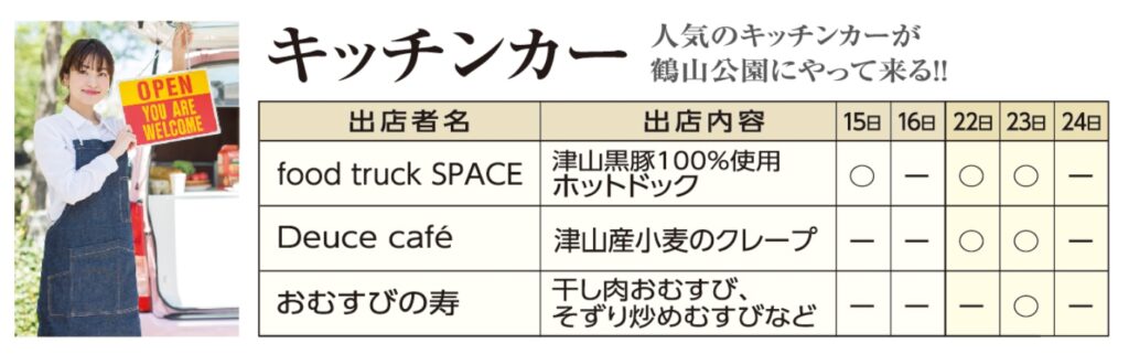 さらに津山城もみじまつり2025の開催期間中には、ご当地グルメフェスティバルとは別にキッチンカーが3台出店します。