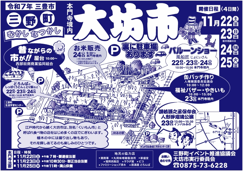 香川県の本門寺の大坊市2025(食いもん市)について、開催日程・時間や場所、屋台・露店の出店、見どころ、アクセスや駐車場等気になりますよね。ここでは、大坊市2025の日程・時間や場所、屋台・露店の出店、魅力や見どころ、アクセスや駐車場を紹介します。