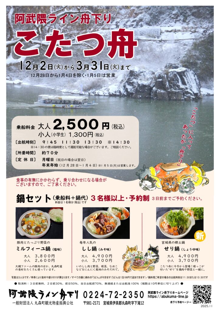 2025年の「阿武隈ライン舟下りこたつ舟」は、以下の通り開催されます。