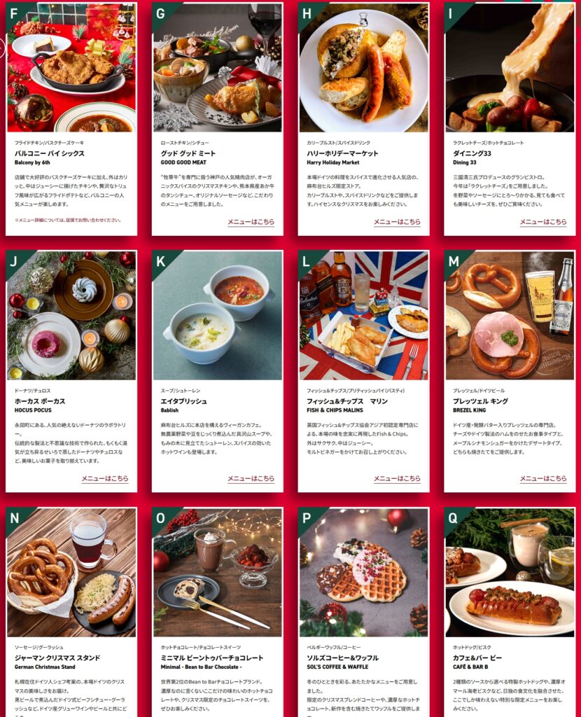麻布台ヒルズクリスマスマーケット2025の飲食店出店は12店舗です。限定フードメニューが満喫できますよ。