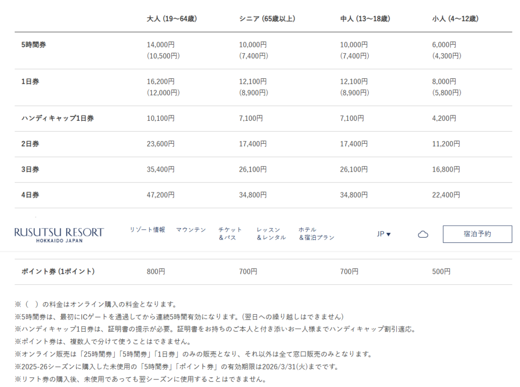 ルスツスキー場2025-2026リフト券やシーズン券の料金は?購入方法は?