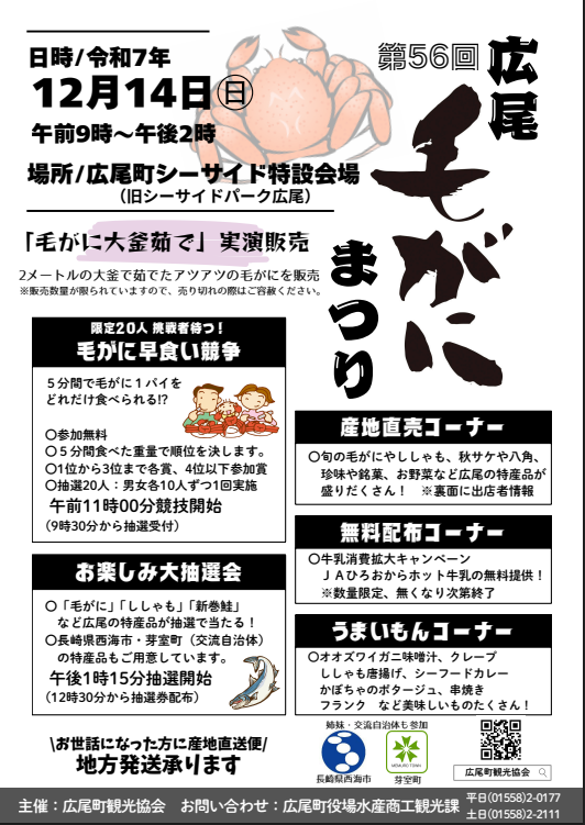 「第56回広尾毛がにまつり(広尾まんぷくまつり)」開催当日である、2025年12月14日(日)の12:30からは、会場内の本部で抽選券を配布します。