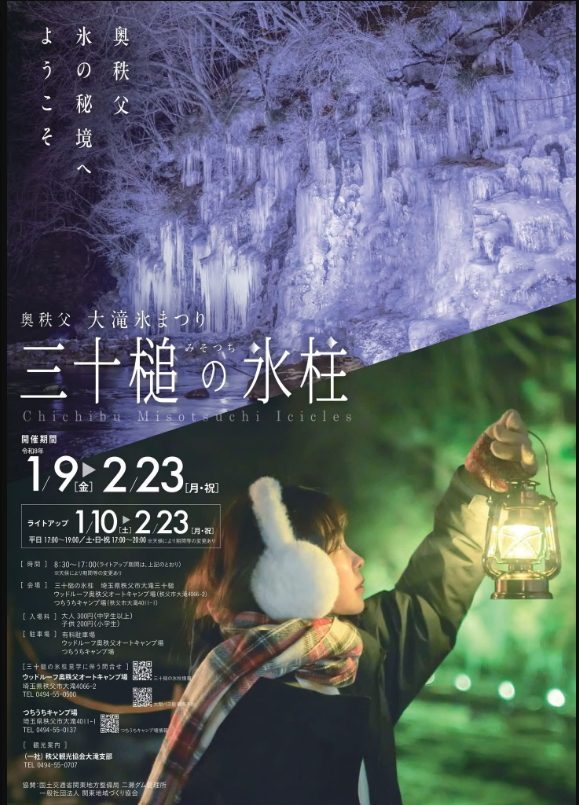 埼玉県奥秩父の三十槌の氷柱について、2026年見頃時期やライトアップ日程、料金、見どころ、おすすめ服装、アクセスや駐車場等気になりますよね。ここでは、 三十槌の氷柱の2026年の見頃時期やライトアップ日程、大滝氷まつり、魅力や見どころ、おすすめの服装、 アクセス(行き方)や駐車場、バスツアーを紹介します。