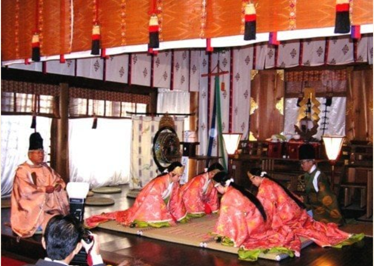 「秋の田のかほりの庵の苫をあらみわが衣手は露にぬれつつ」を神前で朗読し、采女装束を着用した4名の取姫が儀式的にかるたを取ります(かるた開きの儀)。