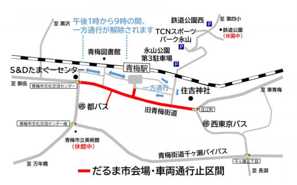 青梅だるま市が開催される2026年1月12日(月)13時から21時まで、旧青梅街道の住江町交差点から文化交流センター交差点まで約600mを一般車両通行止めにし、歩行者天国にになります。