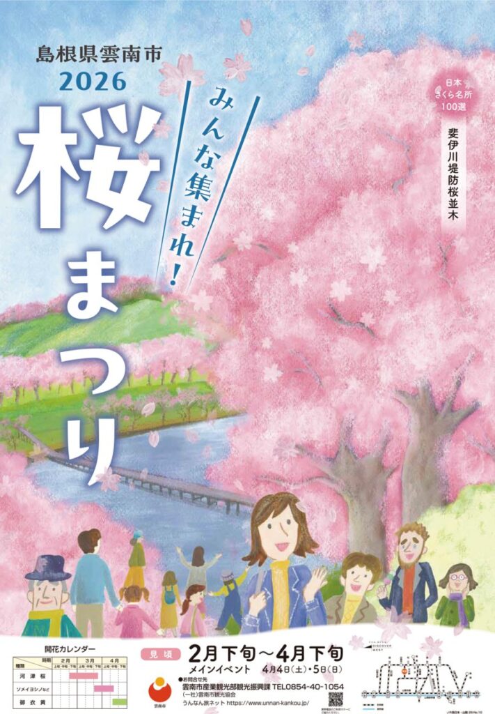島根県の雲南市桜まつり2026について、見頃時期や開花状況、日程や場所、マルシェ等屋台・露店の出店、アクセスや駐車場等気になりますよね。ここでは、雲南市桜まつり2026の見頃時期や開花状況、日程や場所、マルシェ等屋台・露店の出店、アクセスや駐車場、イベント内容や見どころを紹介します。