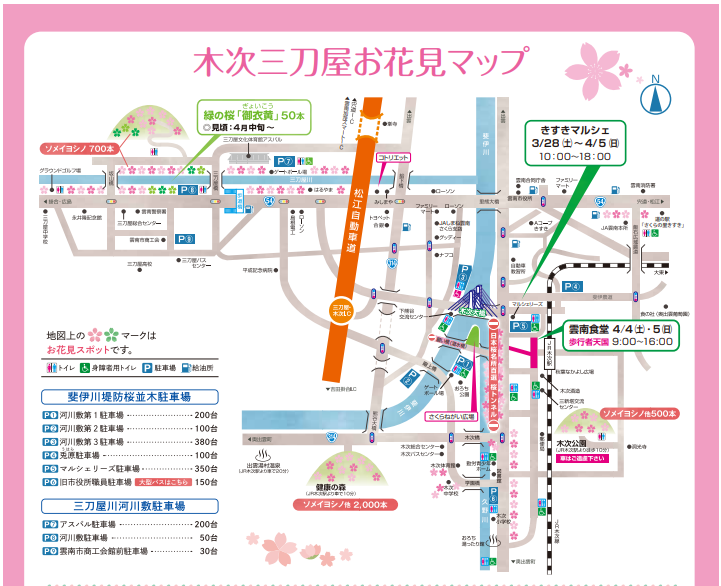 雲南市桜まつり2026の駐車場は、下記の通りです。